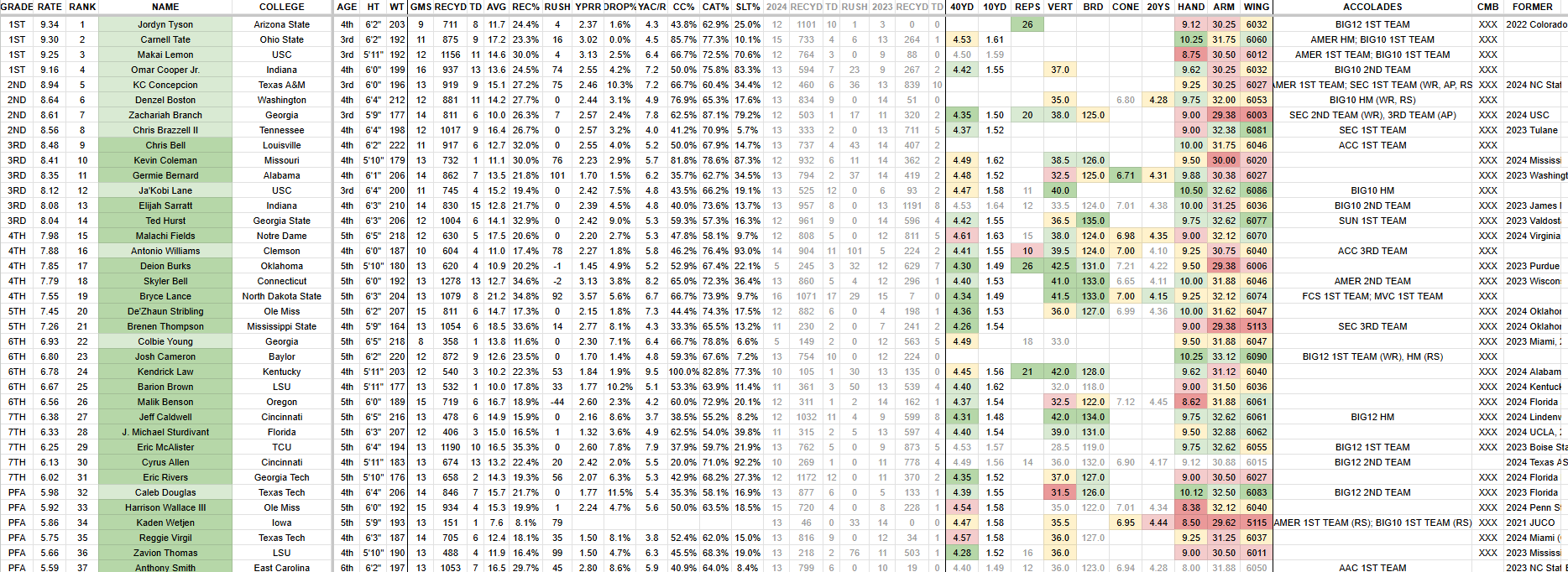 Colors represent the percentile of the athletic measurable within the position group (since 2017).